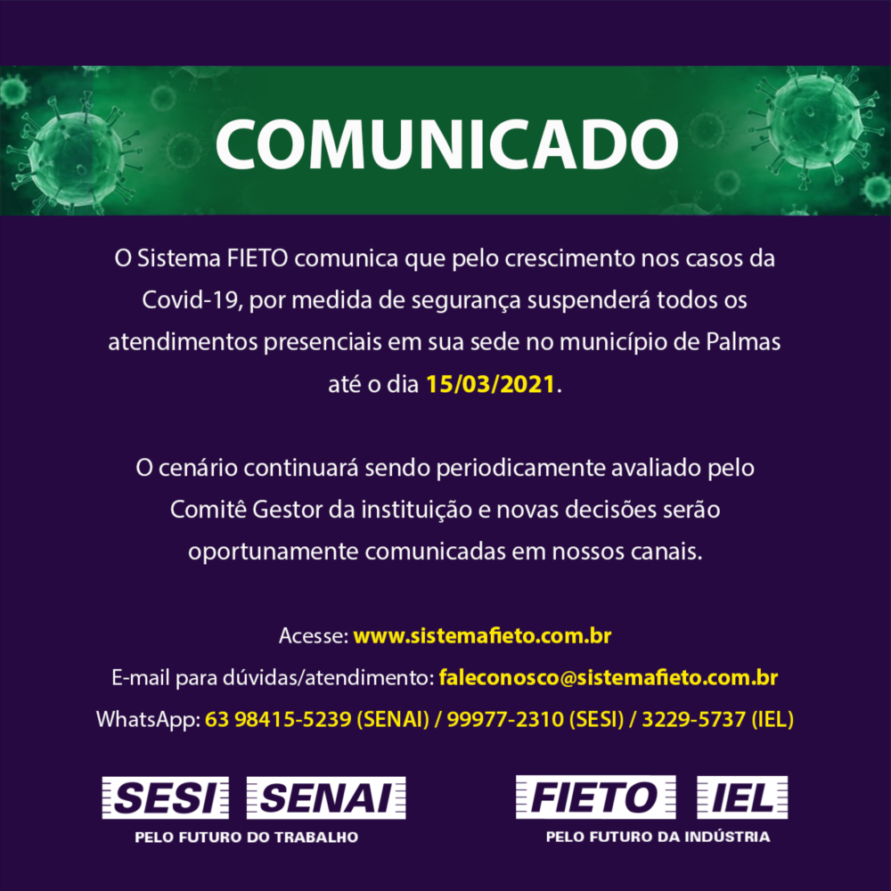 O Sistema FIETO comunica que devido ao crescimento nos casos da Covid-19, por medida de segurança, suspenderá todos os atendimentos presenciais em sua sede no município de Palmas até o dia 15/03/2021.