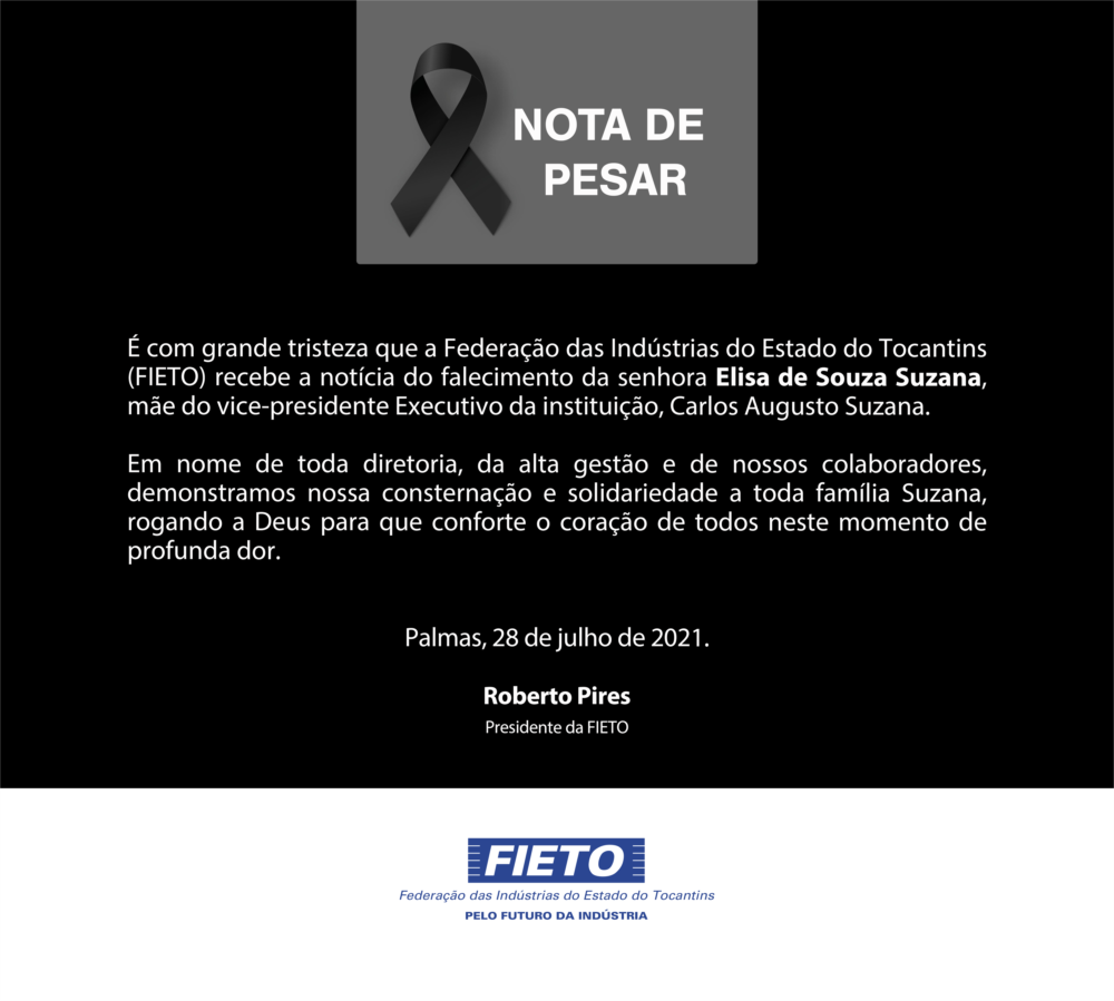 É com grande tristeza que a Federação das Indústrias do Estado do Tocantins (FIETO) recebe a notícia do falecimento da senhora Elisa de Souza Suzana, mãe do vice-presidente Executivo da instituição, Carlos Augusto Suzana. Em nome de toda diretoria, da alta gestão e de nossos colaboradores, demonstramos nossa consternação e solidariedade a toda família Suzana, rogando a Deus para que conforte o coração de todos neste momento de profunda dor.